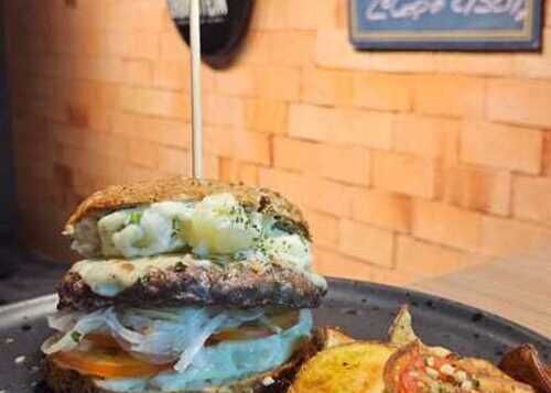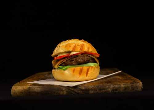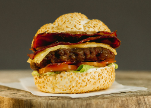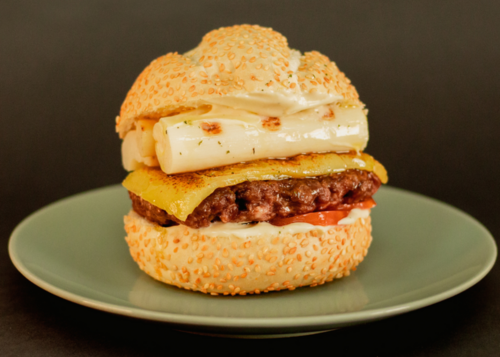 Hambúguer, palmito na brasa gratinado com queijo Gruyere, azeite de manjericão, tomate e molho de queijo.