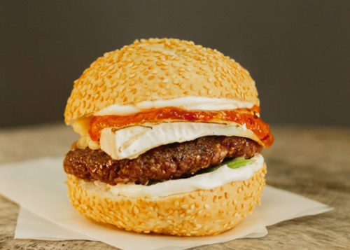 Hambúrguer, queijo brie, geleia de pimenta, molho de queijo suave e alface americana.